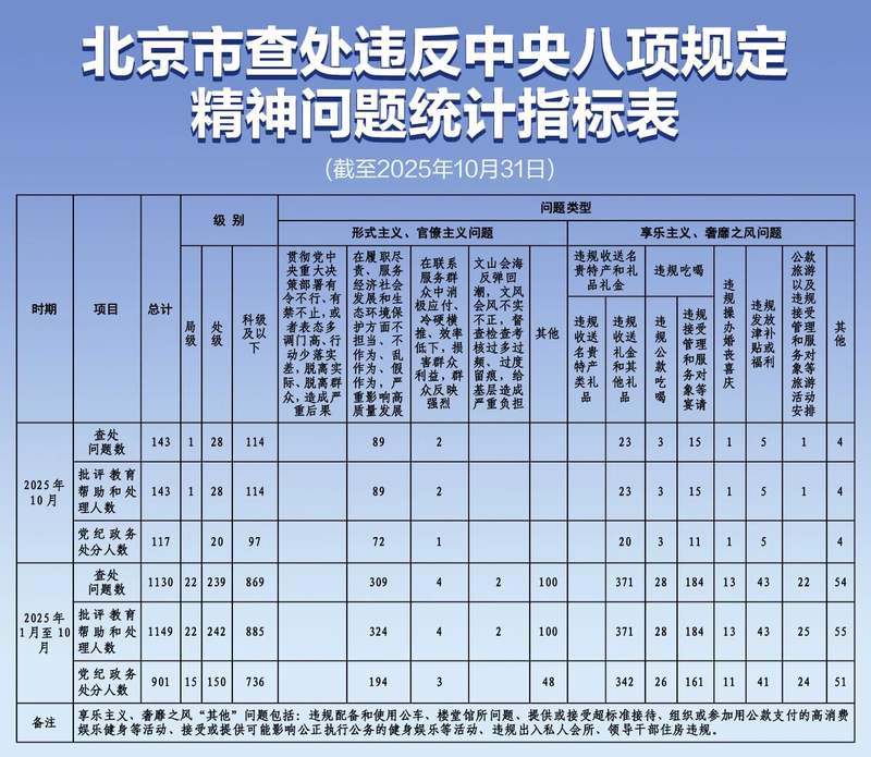 新京报青峰 据北京市官方微信公众号消息,市纪委监委近日发布了今年1月至10月查处违反中央八项规定精神问题统计指标。截至10月31日,共查处违反中央八项规定精神卫生问题案件1130起,批评教育、帮助治疗1149人,其中处级22人,处级242人,处级及以下885人。受到批评教育、支持和回应的1149人中,受到党纪政务处分的901人,其中厅级15人,厅级150人,厅级及以下736人。调查的问题类型包括两大类主题:官僚主义与官僚主义、官僚主义和官僚主义。享乐主义和奢华。其中,从官僚主义、官僚主义角度,查处问题主要集中在“在履行职能、为经济社会发展和保护生态环境作出贡献等方面不负责任、不作为、随意作为、虚假作为,严重影响发展质量”。批评教育、支持关心群众324人。在享受和浪费方面,查处的主要领域为“骗取礼品等”、“骗取企业主、服务商的宴请”和“骗取补贴福利”等,批评、启发、支持、处罚人数分别为371人、184人、43人。今年10月,全市共查处违反中央八号规定精神疾病案件143起,批评教育、支持和处罚共计143人。人员:厅级1人,厅级28人,厅级以下114人。 117人受到党纪政务处分。其中,正厅级20人,副厅级97人。查处的问题主要集中在“履行职责、服务经济社会发展和保护生态环境等方面不负责任、不作为、乱作为、虚假行为,严重影响质量发展”、“违法赠送、收受礼品等”等方面。以及“非法举办企业主、服务提供者的宴会”。编辑 毛天宇