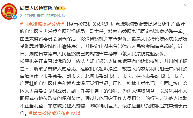据新京报@最高人民检察院微博消息,广西壮族自治区人大常委会原委员、副主任、桂林市委原书记周家斌涉嫌受贿罪。国家监察委员会已完成调查,并移送检察院审查和处理。最高人民检察院决定以涉嫌受贿罪依法逮捕周家斌,并指定湖南省常德市人民检察院作为侦查起诉对象。近日,湖南省常德市人民检察院向湖南省常德市中级人民法院提起公诉。在讯问起诉阶段,检方告知被告人周家斌有权依法提起诉讼,讯问了被告人周家斌。并听取了被告人的意见。检察机关指控周家斌利用担任南宁市委常委、广西壮族自治区副市长,北海市委副书记、市长,桂林市委副书记、市长,广西壮族自治区党组书记、城乡建设办公室书记,桂林市委书记等职务,实施职务犯罪。广西壮族自治区市委委员、人大常委会委员。利用班子成员、副处长等职务,利用其他国家公务人员职权、职务便利,为他人谋取不正当利益,在履行职责过程中非法收受他人财物,数额特别重大的,依法以受贿罪追究刑事责任。很大。编辑 申真