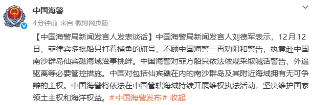 新京报讯 据中国海警博客报道,中国海警发言人刘德军12月12日表示,多艘菲律宾船只不顾中国海警的多次扣押和警告,以捕鱼为名前往中国南沙仙宾礁地区,执意寻衅滋事。中国海警依据法律法规,对菲律宾船只采取警告、驱逐等必要管控措施。中国对包括仙宾礁在内的南沙群岛及其附近海域拥有无可争议的主权。中国海警将继续依法在中国管辖海域开展维权执法活动,坚决维护国家领土主权和海洋权益。李依林吉编辑